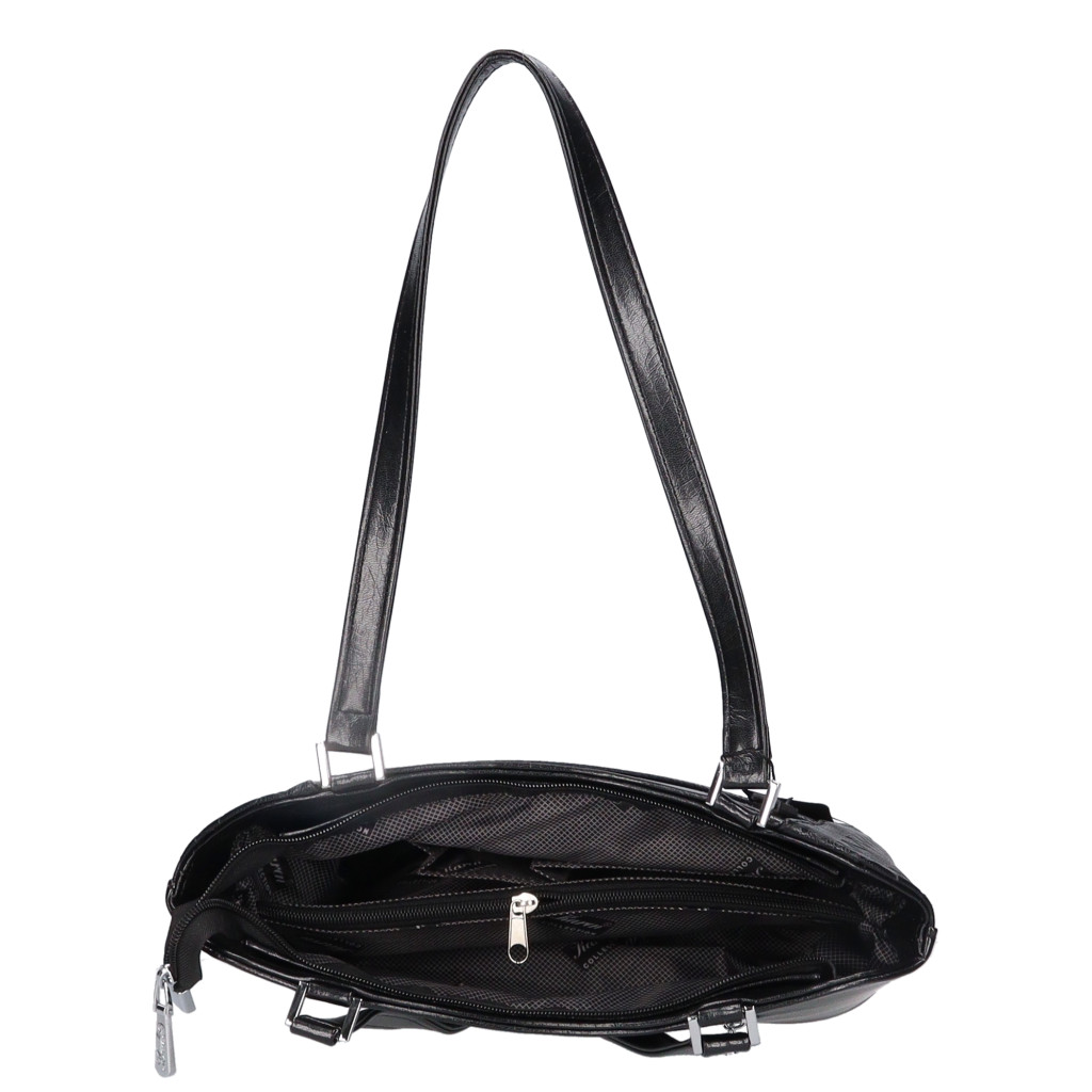 Karen rostbőr női válltáskaelegáns fazoncipzáras fő rekeszbelül osztottcipzáras elválasztóvalbelül cipzáras zseb és mobiltartóelől zsebhátulján cipzáras zsebalján fém védőtalpakvállpántja: 65 cmSzé:34x Ma:22x Mé:10 cm
