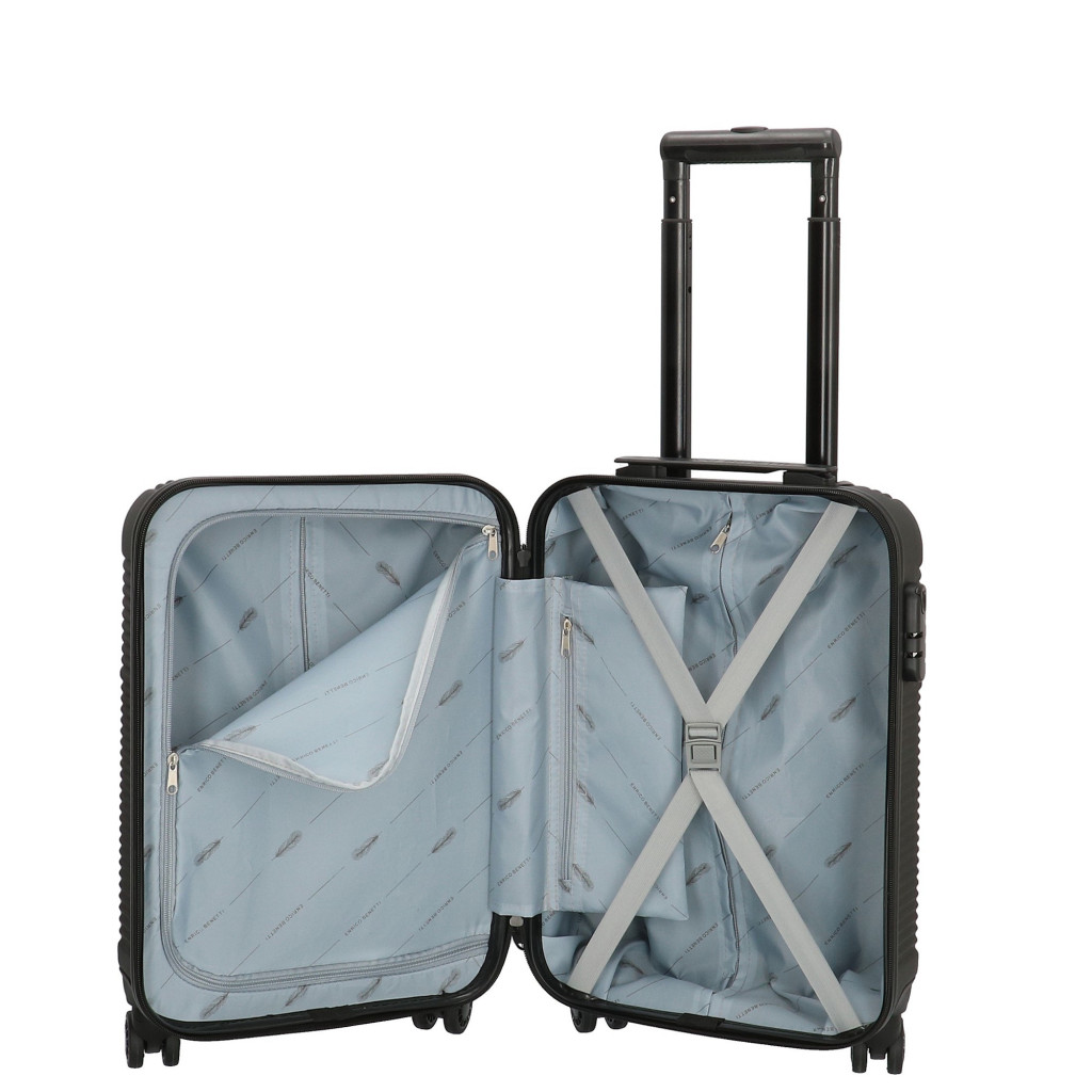 Enrico Benetti Louisville kabin méretű bőröndkönnyű és stílusos Louisville sorozatpár napos utazáshoz ajánljukanyaga karcálló, robusztus ABSstrapabíró dupla kerekes, finoman gördülő négykerekűtetején és oldalán fix kézbefogó fogantyútetején két szekcióban kihúzható, masszív húzókarralkörbe cipzáras záródásúaz oldalán 3-jegyű számzár, a fő cipzárak lezárásáhoza számzár egyénileg, tetszés szerint egyszerűen programozhatóbelül teljesen bélelet poliészter tere lenyűgözbelseje két rekeszes, cipzáras elválasztókkal, cipzáras zsebbel és állítható ruha rögzítő kereszt pántokkalméretek (szélesség x magasság x mélység) 33 x 52 x 22 cm (magába foglalva a kerekeket, fogantyúkat)súlya 2,5 kg. térfogata 30 l. Garancia 1 év.